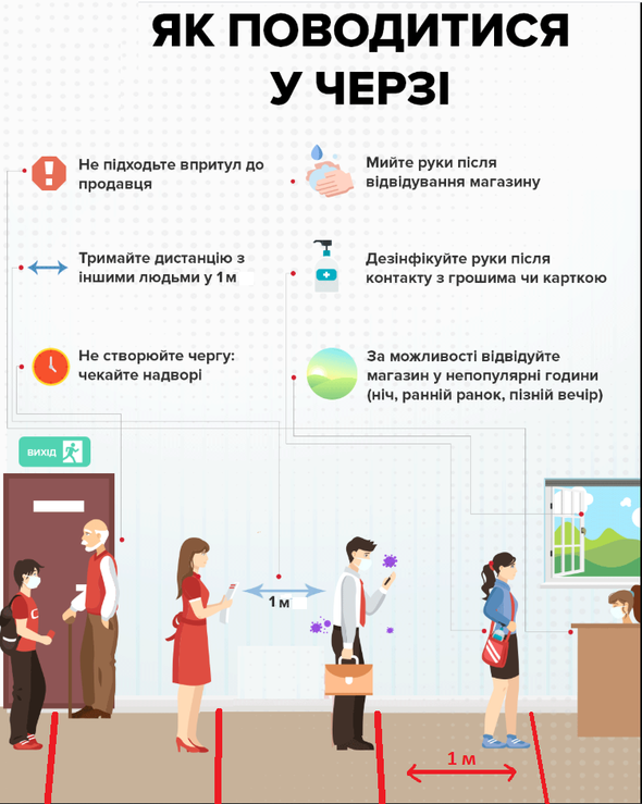 утримання від контактів з особами, що мають симптоми респіраторних захворювань – кашель, лихоманка, ломота в тілі, або збереження обов’язкової дистанції та обмеження часу при контакті (не менше 1 метра);